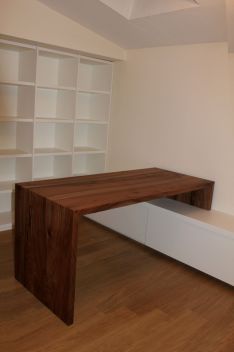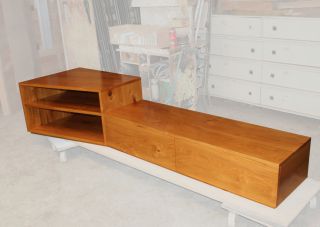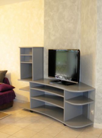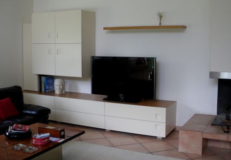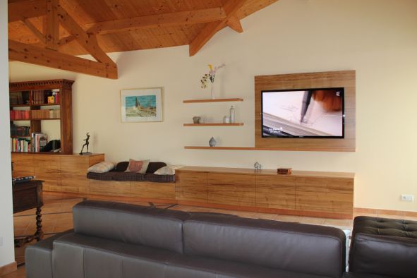 Agencement en acacia, intérieur en multiplis peuplier. Ouverture des portes et tiroirs en pousse-lache. Le tableau Tv et les étagères murales ont été fabriquées dans un 2 éme temps.