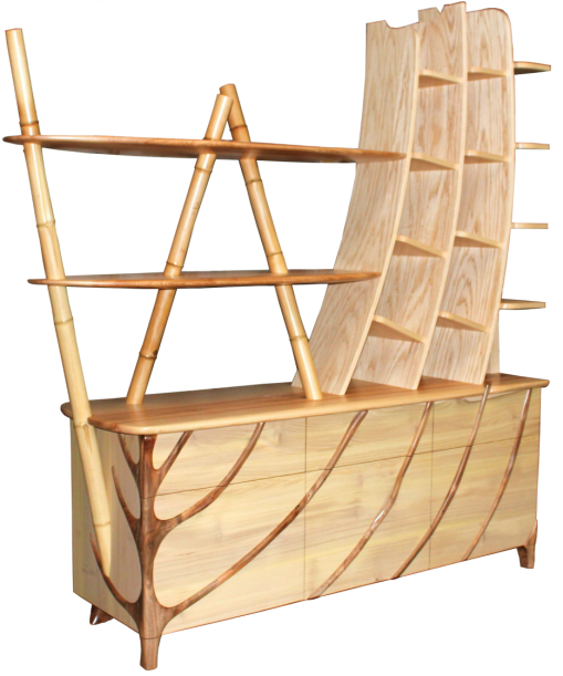 Meuble imaginé par le client, fabrication de la bibliothèque courbe en frêne sur dosse pour utiliser des motifs de bois très flammés, planches de surf et plateau en frêne olivier, support en bambou diamètre 60, partie basse 6 tiroirs en acacia applique en noyer.