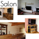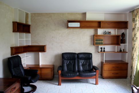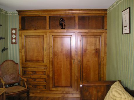 Eléments bois: fabrication en merisier de pays, et panneaux lattés plaqués merisier, Finition teintée patinée et vernis.