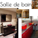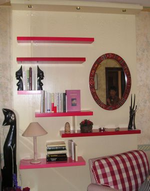 Bibliothèque décor, le panneau cache une ancienne cheminée démontée. Les étagères sont assorties au coussin. Le miroir réalisé par la cliente prend place sur le panneau.