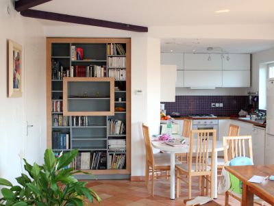 La chambre secrète, La bibliothèque sur roulettes pivote sur un axe. Meuble en mdf laqué, Les cadres sont en frêne
