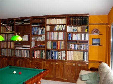 Bibliothèque marine, fabriquée en sapelli teinté et vernis, Les poigneés et les équerres décoratives sont en laiton. Les meubles sont ajustés au sol et au plafond.