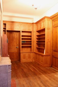 Fabrication en chêne, Finition teintée clair et cirée. L'ensemble est ajusté pour encadrer les portes existantes