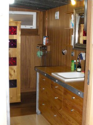 Lambris et bac à douche en iroko. Mobilier en acacia, bandeau et pieds en hêtre patine métal